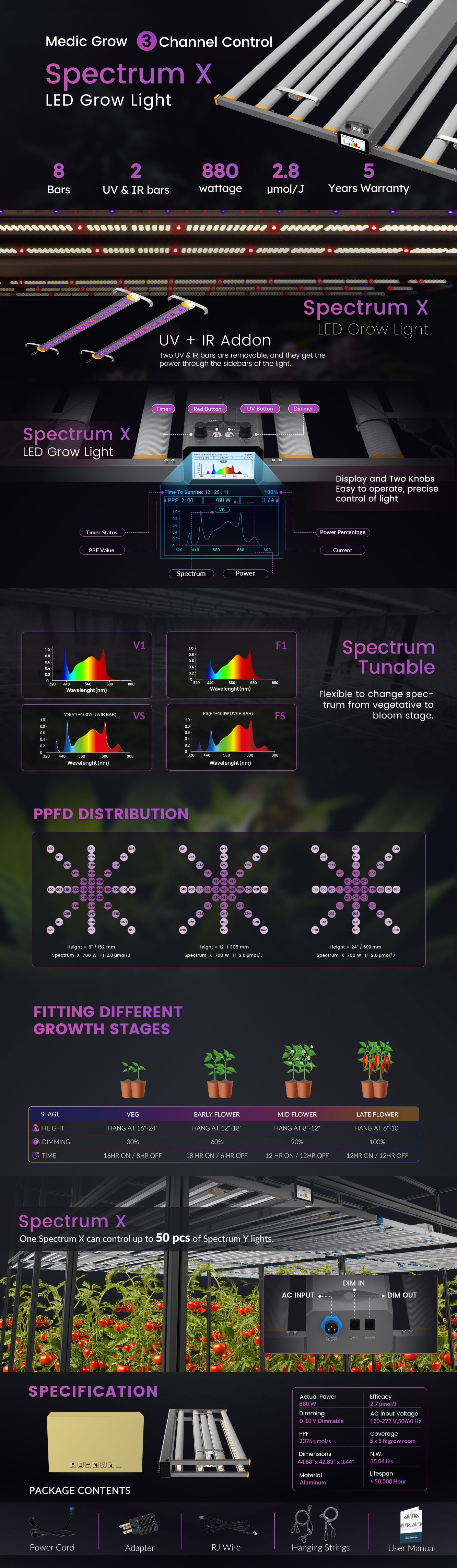 | LED Diodes | Osram 660NM Red Chips @80pcs and San'An White Chips 4000K @2880PCS | Osram 660NM Red Chips @80pcs and San'An White Chips 4000K @2880PCS and UV Chips@30PCS and IR Chips@60PCS |