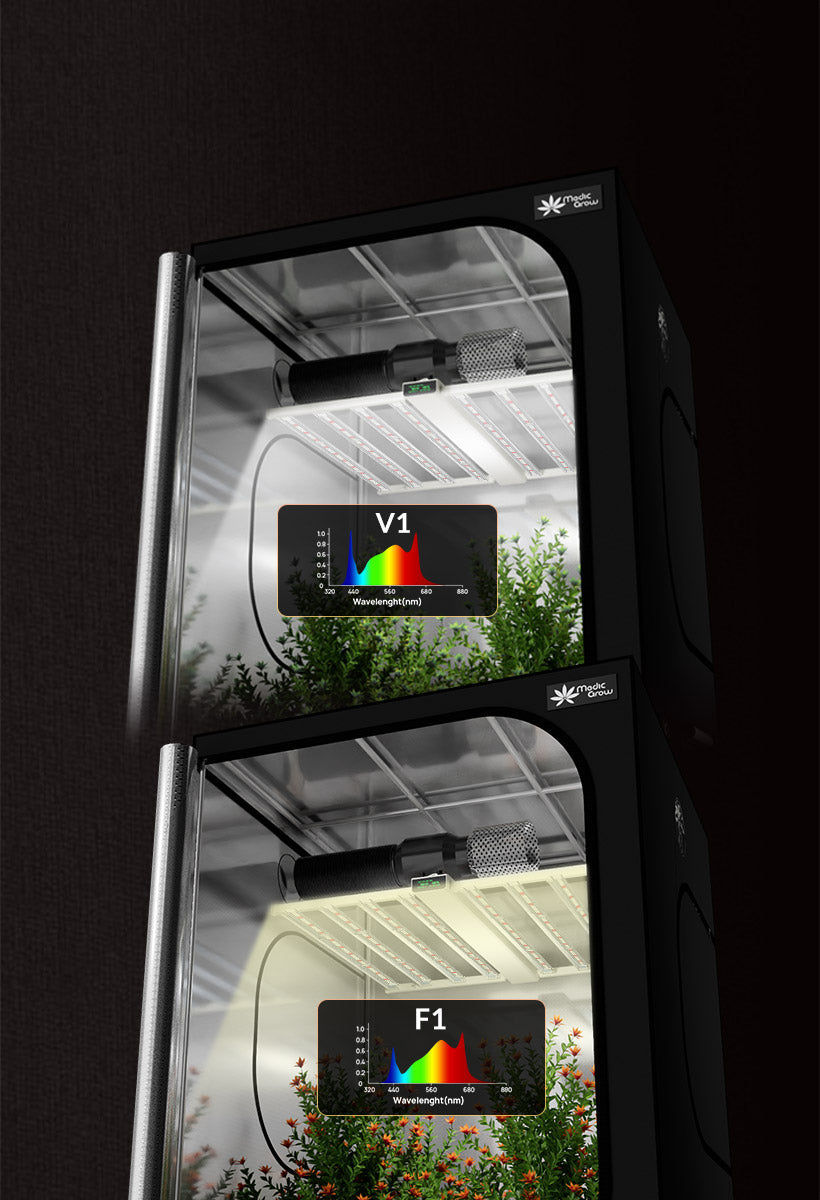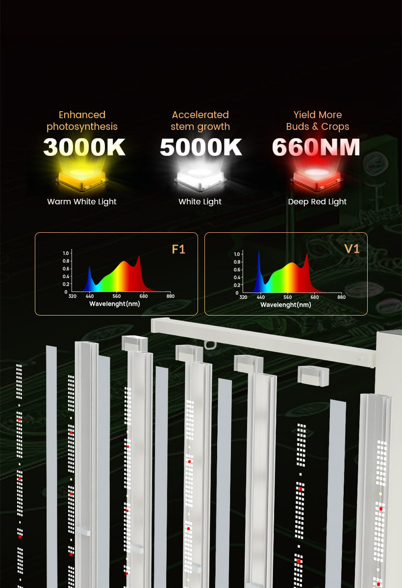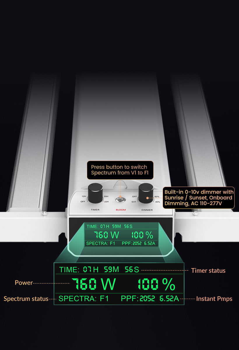 The Smart-8 also features a convenient Bloom button for easy switching between vegetative (V1) and flowering (F1) modes. Its wave-shaped heat sink design rapidly dissipates heat, while the multi-bar structure prevents hot spots, ensuring your plants remain cool and thriving.