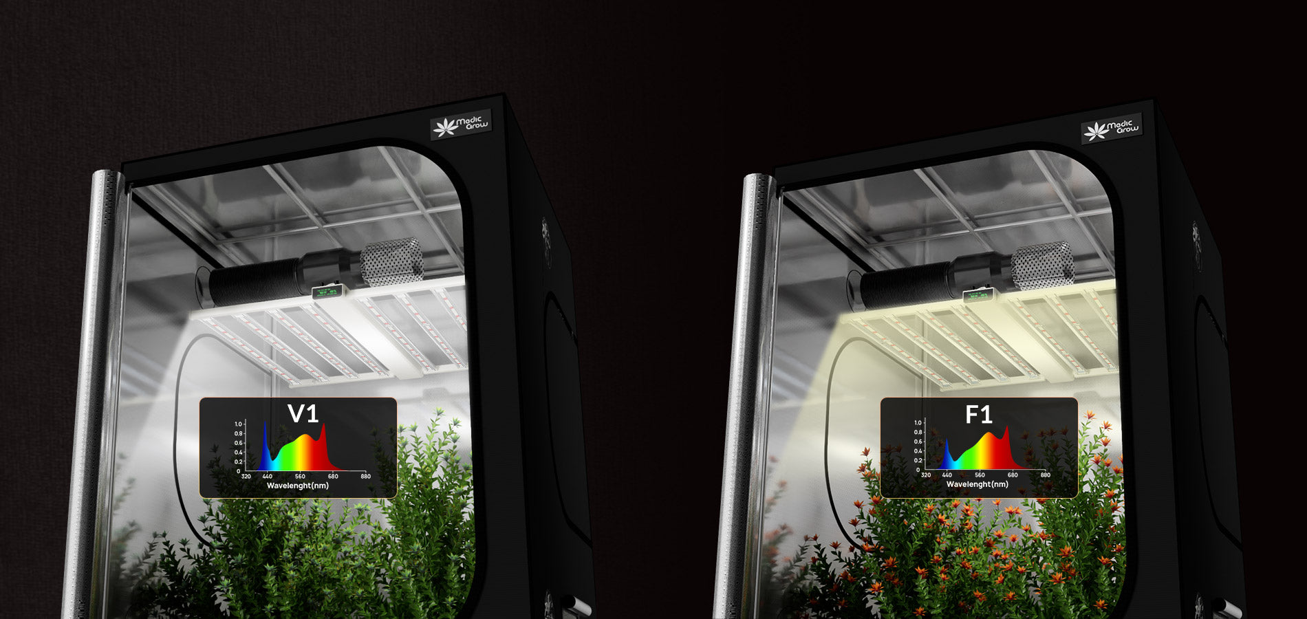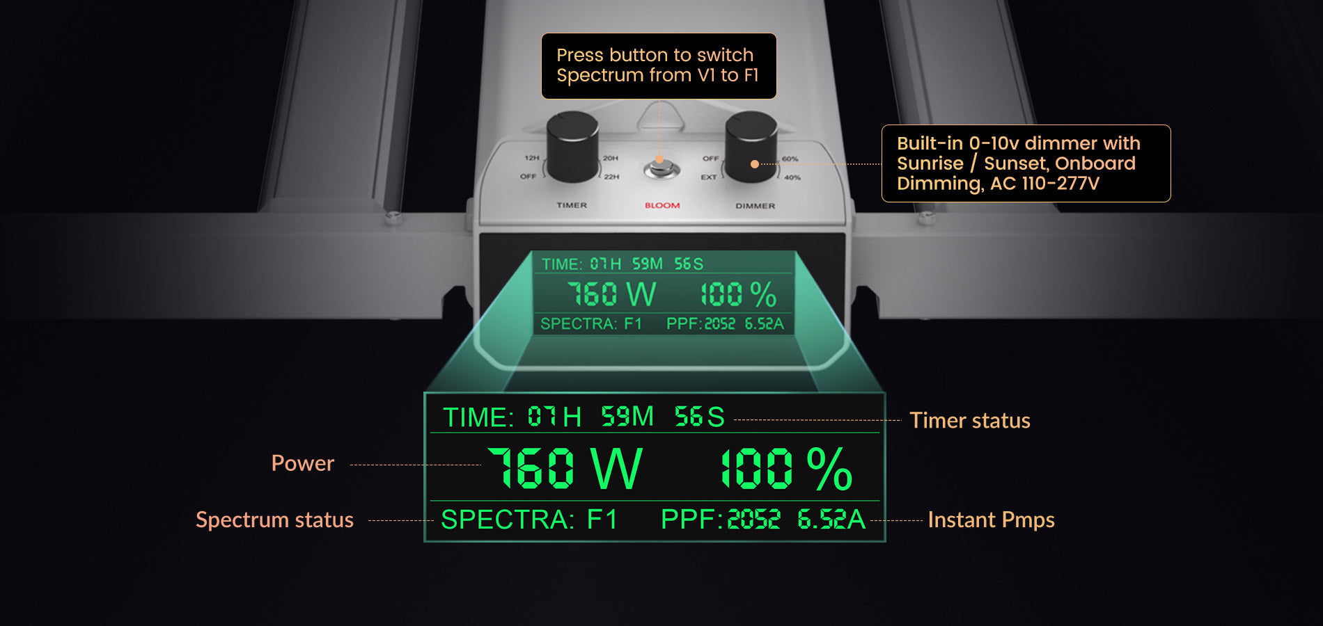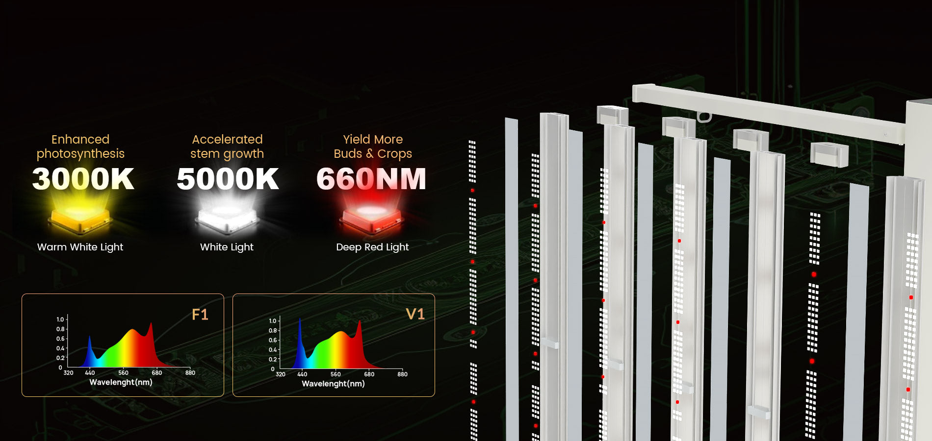 The Smart-8 also features a convenient Bloom button for easy switching between vegetative (V1) and flowering (F1) modes. Its wave-shaped heat sink design rapidly dissipates heat, while the multi-bar structure prevents hot spots, ensuring your plants remain cool and thriving.
