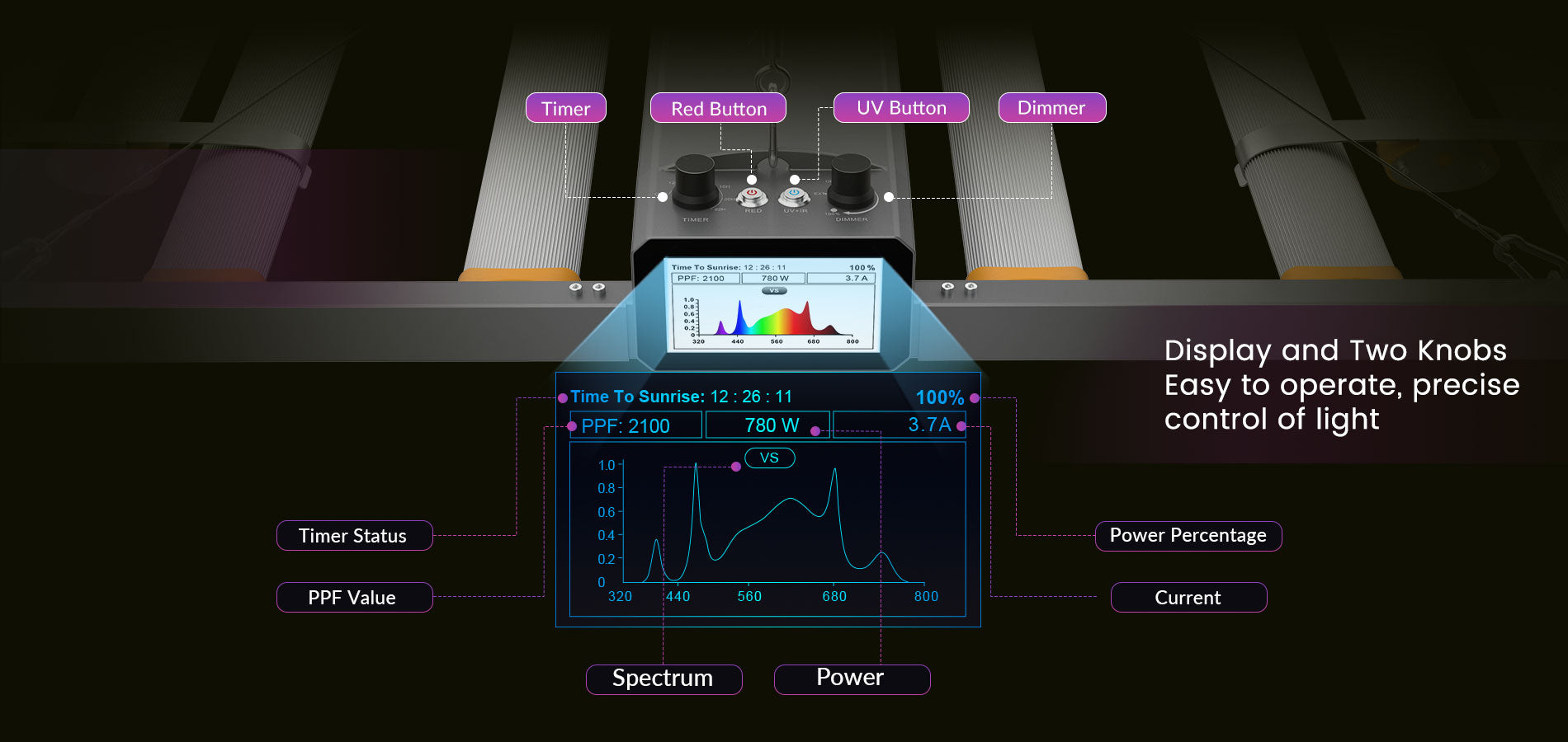 这款 LED 灯配有显示屏,可显示光谱、瓦数、PPF 值等。顶部旋钮可让您设置照明时间表(6 至 18 小时)并调整亮度(30%-100%)。它还具有可拆卸的 UV/IR 模块,可提供 2 种可调光谱: