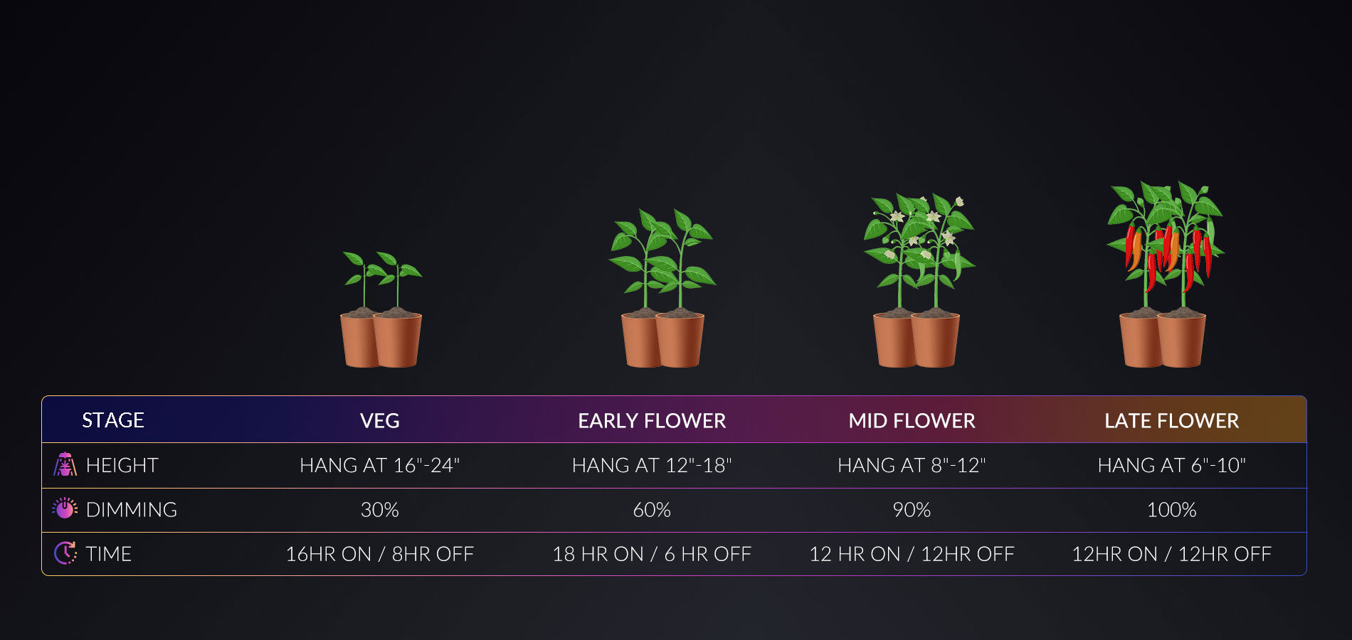 - UV/IR 有助于促进茎的更强生长、节点间距适当以及花朵产量增加。