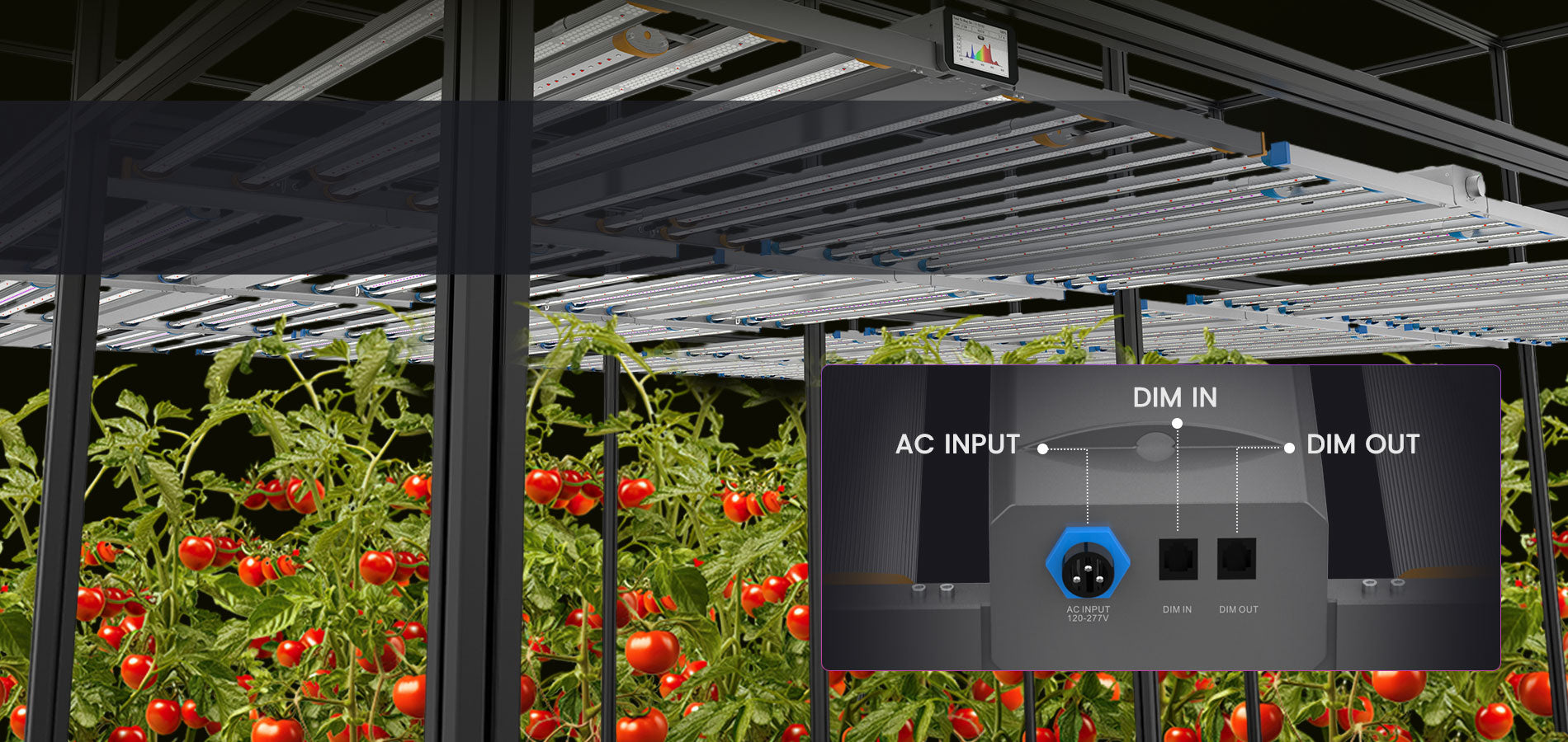 Spectrum X 不需要任何其他控制器。商业种植者可以将 50 盏 Spectrum Y 灯与一台 Spectrum X 同步并同时控制它们。换句话说,这 50 盏灯具充当工作站,而 Spectrum X 充当主站。种植者只需控制主站即可使各个站点协同工作。无论您在 Spectrum X 上设置哪种光谱、照明水平或任何光周期,所有灯都可以完成相同的工作。